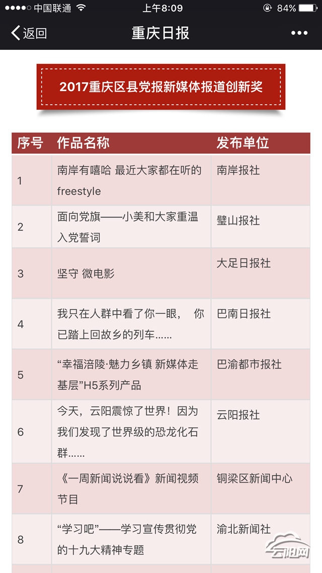 據介紹,2017重慶區縣黨報新媒體好作品評審會有32個區縣黨報報送的優秀作品和10個由網友投票選出的人氣作品入圍本次總評選,經過重慶市新聞工作者協會、重慶日報業集團、重慶市報業協會、重慶市黨報新媒體聯席會、重慶大學和西南大學的專家教授組成的評審團認真評議并投票評選出兩個獎項——“2017年重慶區縣黨報微信公號(新媒體)年度年度十佳好作品”和“2017重慶區縣黨報新媒體報道創新獎”,共20個獲獎作品,其中,云陽報社的作品《今天,云陽震驚了世界!因為我們發現了世界級的恐龍化石群……》獲得2017重慶區縣黨報新媒體報道創新獎。
