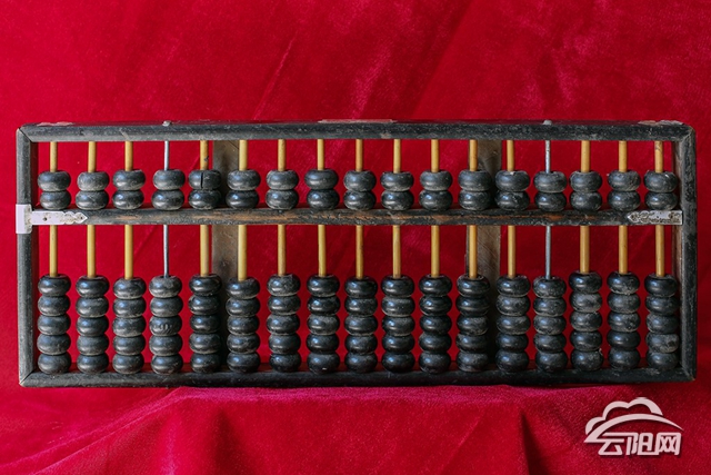 在云陽地稅局二樓的老物件展廳中,有一把上世紀八十年代的17檔7珠老式算盤,銘牌上生產廠家的電話號碼還是五位數。由于年代較久,而使用頻率又極高,有兩顆算珠已出現裂口,其余算珠和木邊框也是傷痕累累、體無完膚,只有四角的鋁質包皮尚較完好,然而,已是重新換過了的。