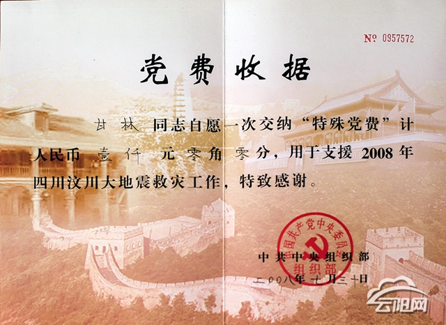 “聚少能成多,一千元做不了什么,但千千萬萬個一千元就很多了。”這是甘林捐款時,對募捐的同事說的一句話。此時他已身患絕癥,面臨每年10多萬元的醫療費用支出。正如他所言,聚少成多,聚沙成塔,一筆筆捐款涌向汶川,汶川才能迅速重建。為鼓勵甘林無私奉獻的精神,中央組織部特為他開具了一份精美的、如證書般大小的“黨費收據”,上面寫著:“甘林同志自愿一次交納‘特殊黨費’計人民幣壹仟元零角零分,用于支援2008年四川汶川大地震救災工作,特致感謝。”