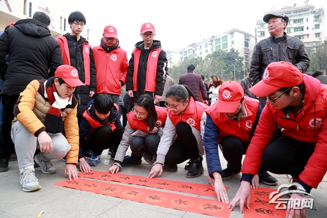 云陽(yáng)網(wǎng)訊(記者 王彬彬 實(shí)習(xí)生 劉耕銘)“老爺爺,等您要的這幅春聯(lián)晾干一下就給您送過(guò)來(lái)。”2月6日,在雙江街道桂灣社區(qū),一群穿著紅色褂子的志愿者為居民贈(zèng)送春聯(lián),還上門(mén)貼春聯(lián),為老百姓送去節(jié)日的祝福。