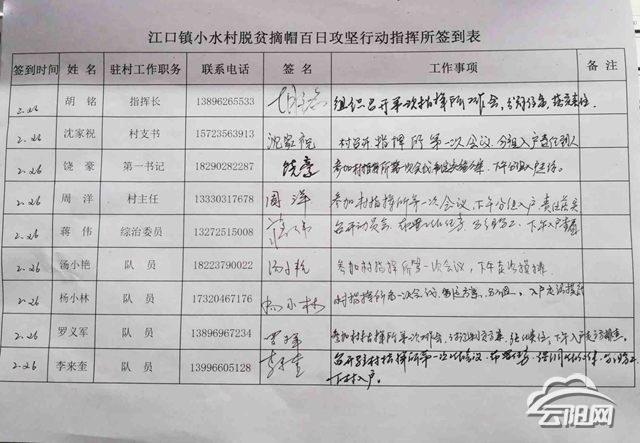 2月26日早上8點(diǎn),在江口鎮(zhèn)小水村便民服務(wù)中心脫貧摘帽攻堅(jiān)行動(dòng)作戰(zhàn)指揮室,縣教委扶貧工作隊(duì)員在指揮長(zhǎng)胡銘的指揮下,明確了具體工作內(nèi)容、責(zé)任、工作時(shí)間、工作紀(jì)律等。
