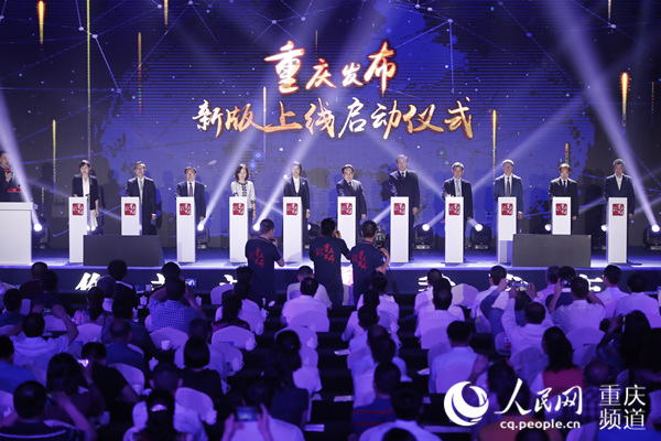 與會(huì)領(lǐng)導(dǎo)攜手點(diǎn)亮“重慶發(fā)布”新版上線啟動(dòng)儀式。