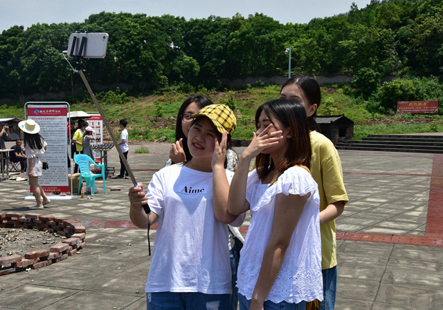 正值中午,太陽火辣辣,但是也比不上大家的熱情,不少情侶身著情侶裝,帶著自拍桿在活動現場拍下合照。