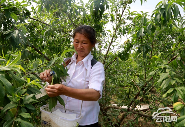 5月29日,在鳳鳴鎮陽鳳村的晚熟桃基地里,工人們正在蔬果。該基地種有晚熟桃100余畝,基地在提升水果產業由“量”向“質”轉型過程中,充分利用科技知識,力爭一次性轉型成功。據悉,該桃園的晚熟桃將在7月底進入采摘期,可持續到8月底。(王彬彬 攝)