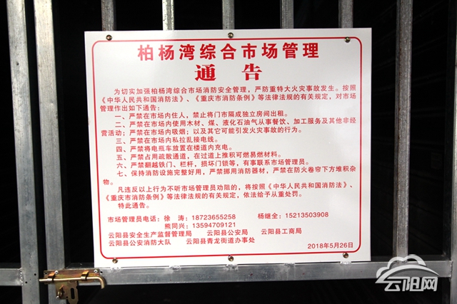據了解,本次消防安全檢查是對柏楊灣市場第一階段消防安全整改的驗收,以及布置下一階段整改內容的一次專項檢查。檢查過程中,檢查人員重點檢查市場一樓、二樓、負一樓的商戶是否完全搬離、是否在出入口安裝鐵門并張貼整改通知等第一階段整改內容,同時在檢查中還發現,門市上方堆積了很多雜物、應急照明燈等消防設備尚未安裝、疏散通道擁擠、市場內一所職業培訓學校隔墻材料不合格等情況,存在重大火災隱患。從檢查情況來看,市場內涉及到整改的105戶,170人現已全部搬離市場,在市場的各個出入口都安裝了鐵門并張貼整改告示,所有門市均采用“雙鎖制”,市場和商戶各持一把鑰匙,杜絕了整改期間市場內人員出現回流的狀況,為下一階段的整改工作提供了有力保障。