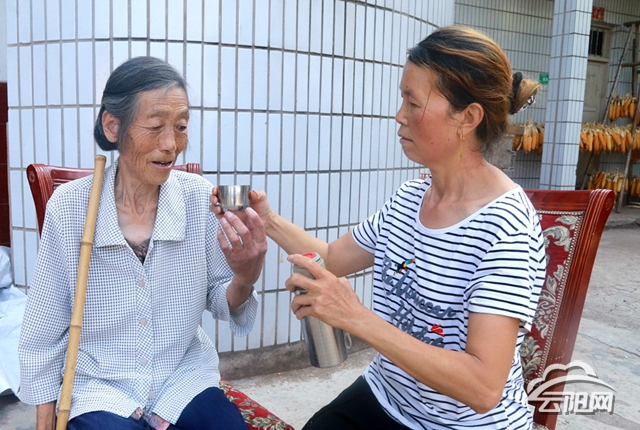 近日,記者在楊志菊家里見到了她和76歲的婆婆廖正爭,楊志菊剛從莊稼地里回來,來不及休息,便進(jìn)屋里拿著開水瓶來到老人面前,輕輕擰開瓶蓋后,將瓶里的水倒入老人專用杯里,輕言細(xì)語地對著婆婆說:“媽,這開水現(xiàn)在不冷不熱,溫度剛剛好,您喝一口。”廖正爭老人接過媳婦端來的開水,笑得合不攏嘴。