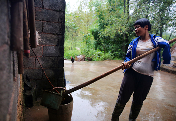 劉從蘭吃力地將農家肥舀到桶里。 通訊員 楊梅娜 丁齊 攝