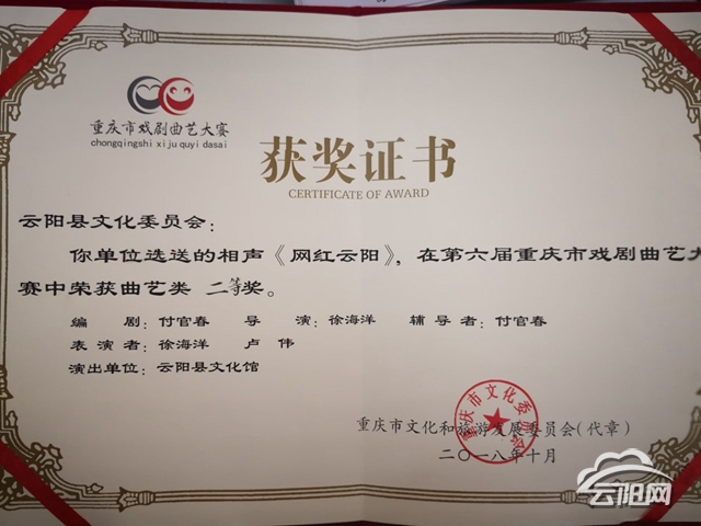 云陽網訊(記者 謝添)11月5日,記者從縣文化館獲悉,在近日舉行的第六屆重慶市戲劇曲藝大賽中,云陽選送的曲藝類相聲《網紅云陽》斬獲曲藝類二等獎,相聲類并列一等獎。