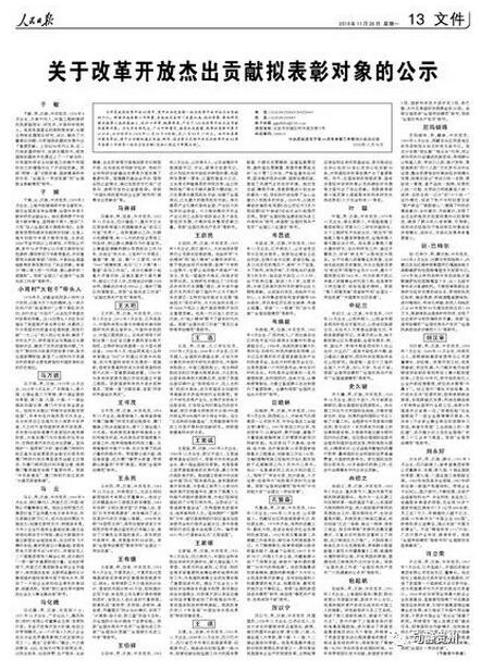 今天,人民日報刊登中央慶祝改革開放40周年表彰工作領導小組辦公室發布的《關于改革開放杰出貢獻擬表彰對象的公示》,公示說:今年是我國改革開放40周年,黨中央決定表彰一批為改革開放作出杰出貢獻的個人。
