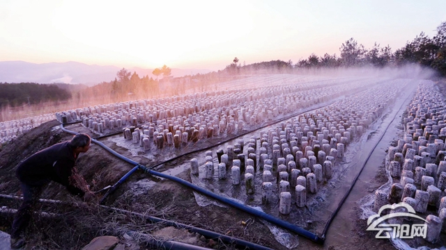 云陽網訊(記者 李充 通訊員 伍遠洋)11月29日,在大陽鎮大樹村桑枝菌基地里,技術員正在給桑枝黑木耳噴水。偌大的基地,一個個桑枝菌棒排列整齊,夕陽余暉映照下,水霧濛濛,頗為壯觀。