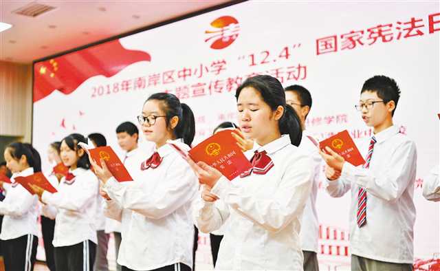 12月4日,南岸區(qū)中小學(xué)國家憲法日主題宣傳教育活動(dòng)現(xiàn)場(chǎng),學(xué)生集體誦讀《中華人民共和國憲法》。此次活動(dòng)旨在進(jìn)一步提高青少年法律意識(shí)和法治觀念,引導(dǎo)青少年知法、懂法、守法和用法。通訊員 郭旭 攝