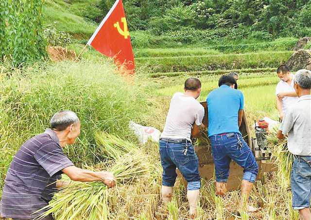 綦江區中峰鎮中峰村,黨員在幫村民收割稻谷。(綦江區委組織部供圖)