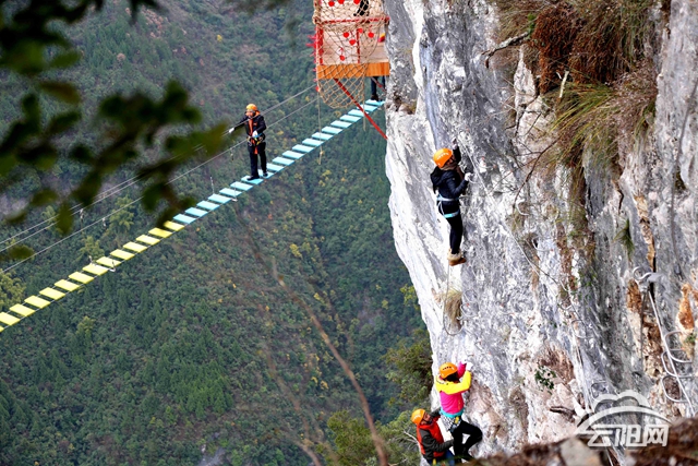 云陽網訊(記者 丁齊)1月1日,時值元旦假期,云陽龍缸景區新開通的“飛拉達”項目——云端彩橋正式建成對外開放,吸引了云陽、奉節、利川等地的數百名戶外運動愛好者前來體驗。游客猶如蜘蛛俠一般,行走在陡峭的巖壁和600米的空中,感受御風而行的刺激和凌空而行的驚奇。