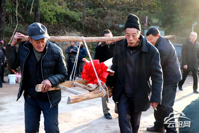 活動(dòng)現(xiàn)場(chǎng),熱鬧的年豬祭祀大典吸引了眾多游客圍觀拍照,按照傳統(tǒng)習(xí)俗,一頭扎著大紅花的年豬被4名村民抬著開(kāi)始了年豬祭祀儀式,寓意來(lái)年紅紅火火,祭祀場(chǎng)面勾起了游客們濃濃的兒時(shí)記憶。