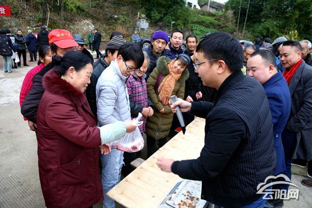 祭祀儀式剛結(jié)束,豬肉估重比賽立即登臺(tái)。兩斤半、一斤七兩……參賽者們拿著豬肉在手中掂量,僅十秒鐘,估重者給出了自己心中的答案。“兩斤半最接近!”主持人揭曉答案,來(lái)自棲霞鎮(zhèn)的游客劉海燕獲得了這塊豬肉,緊隨著是一陣歡呼聲。劉海燕知云安鎮(zhèn)將在銅鼓村舉辦年豬節(jié)消息后,特意和家人趕到云安參加年豬節(jié)。