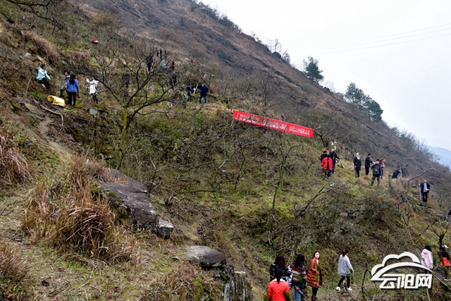 當天早上八點多鐘,200多位手持工具和柏樹苗的干部職工組成了浩浩蕩蕩的植樹“大軍”,向著千峰村生態造林地進發。植樹現場位于小地名下巖洞的一片山梁,植樹隊伍克服著山大坡陡、山路崎嶇的困難,在到達植樹現場后,便齊心協力、有序分工,你打窩、我扶苗,干得熱火朝天。