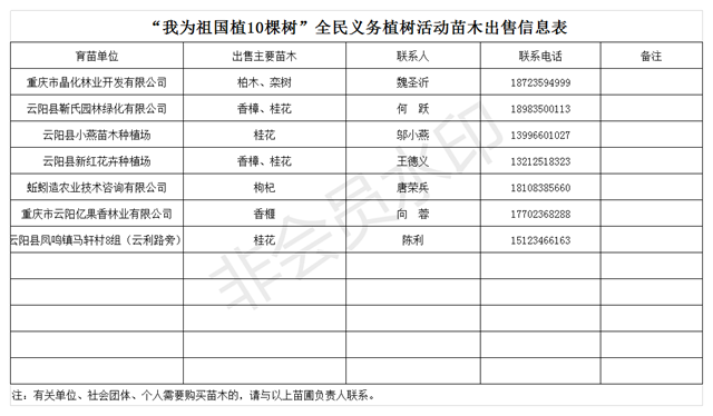 “我為祖國植10棵樹”全民義務植樹活動苗木出售信息表