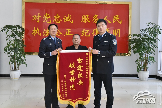 云陽網訊(記者 鄧磊 通訊員 姜偉蘭)3月18日,市民何先生來到云陽縣公安局,為刑警大隊送上一面寫有“雷霆出擊,破案神速”的錦旗。7天前,何先生經營的金店被盜,價值50萬元的黃金飾品失竊,公安局刑偵大隊接警后,不到3天便人贓并獲,追回了全部黃金,何先生十分感激。