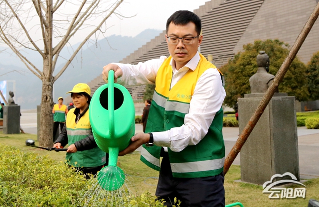 儀式結(jié)束后,覃昌德、吳久華、李大武、朱錫祥與志愿者一起參加了城市管理體驗活動,修剪了兩江廣場周邊綠化帶,并為周邊的花草澆水。