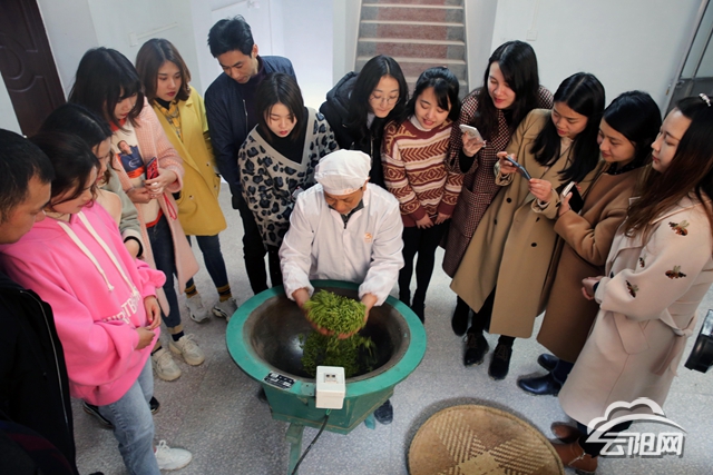 在手工制茶車間,工人師傅打開電炒鍋,當燒到一定溫度后,一個工人師傅將游客采摘的茶芽倒進鍋內不停地翻轉,一會兒,一股股濃濃的白煙從鍋中飄散出來,彌漫了整個車間,游客們呼吸著濃濃的茶香。
