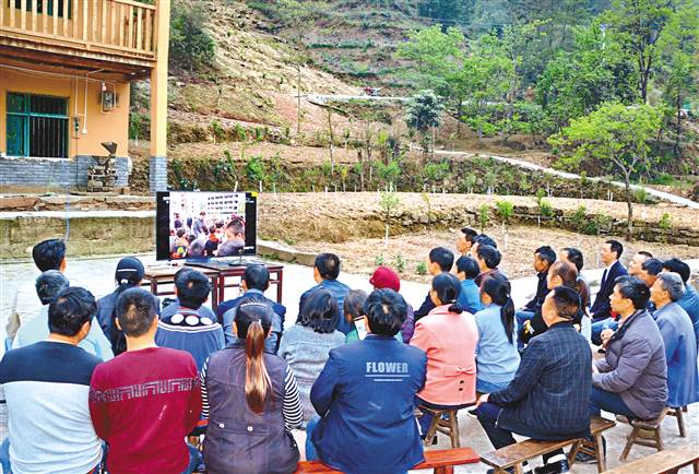 4月17日晚,石柱中益鄉華溪村先鋒組馬培清家的院壩里,干部群眾收看習近平總書記在重慶考察的新聞報道。特約攝影 譚華祥