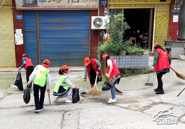 活動中,全體師生及家長代表們共分為6組,分別負責江口場鎮上6個區域的衛生環境。拾撿垃圾、清掃地面、傾倒垃圾……志愿者們分工有序,經過一個上午的辛勤勞動,校園周邊環境得到有效整治。