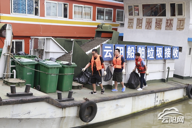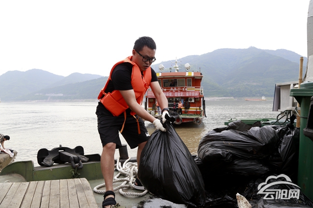 云陽網訊(記者 王彬彬)近日,在兩江假日下巖寺碼頭,記者看見清漂人員正在緊張的工作,張鵬和同事們一起將清漂船上的垃圾轉運到垃圾車上。