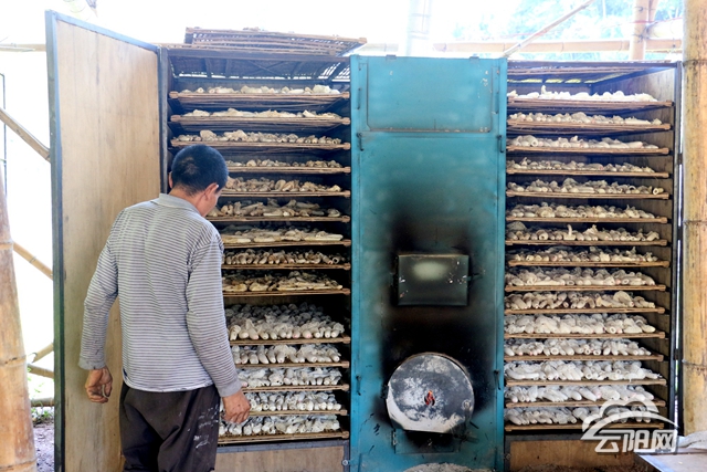 云陽網訊(記者 陳愛玲)近日,桑坪鎮大樹村竹蓀種植基地烘干房里鋪滿了剛摘來的新鮮竹蓀,幾個村民們正把選好的竹蓀送入了烤箱,制作成干竹蓀。