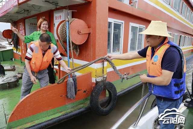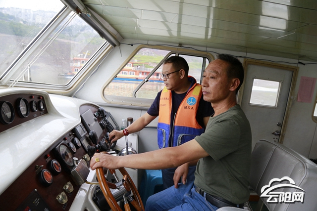 一年365天,袁軍每天都在云陽長江段航行幾十公里,他早上7點半到達碼頭,檢查船舶各種設備,給機艙做衛(wèi)生,確保船艙干凈、整潔。船只8點半準時從碼頭出發(fā)。這段時間正是汛期,而長江里的水位下降快,他們航行的重點工作就是提醒過往船舶遵守水上交通秩序,確保安全航行。在工作中,袁軍用文明語言與過往船只進行交流,提醒船只注意安全。