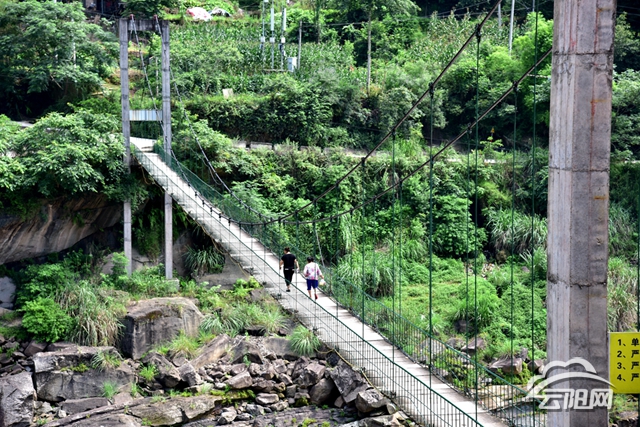 畫中的五峰山上有個五峰村,山腳下、河谷邊是金竹溝社區,與五峰村隔谷相望的便是外郎村、大花村以及五龍村,而連接兩岸村落,方便村民來往的是鐵索吊橋,走上去,晃悠悠,被河面上的涼風一吹,仿佛回到了母親的懷抱里。
