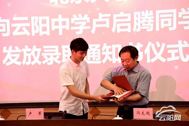 云陽網(wǎng)訊(記者 段斯斯)7月20日,北京大學(xué)北大重慶招生組長馮支越、北大信息科技學(xué)院教授宋國杰一行,不遠千里專程來到云陽中學(xué)為云陽縣理科第一名(全市第14名)盧啟騰同學(xué)現(xiàn)場發(fā)放錄取通知書。