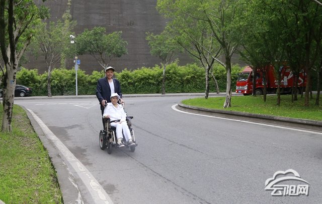 云陽網訊(記者 王彬彬)7月23日,記者在青龍街道張家壩社區看到,一位年過六旬的老大爺用輪椅推著一位老婆婆在壩子上轉悠,兩位老人還不停地嘮著家常,畫面十分溫馨。