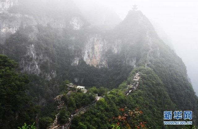 這是7月30日拍攝的霧中的云陽龍缸國家地質公園。 云陽龍缸國家地質公園位于重慶市云陽縣東南隅,深處三峽庫區腹心,景區內地貌奇特、雄險俊秀、風景壯美。 新華社記者王全超攝