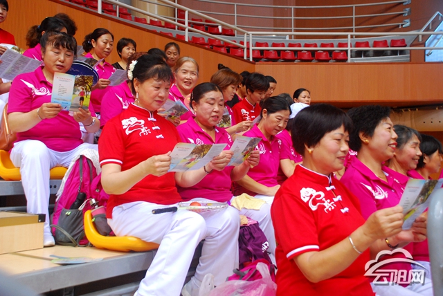 在縣體育館內,縣老年人體育協會進行了展演,表演者們匯聚一起,在音樂的帶動下,他們時而舒展身體,時而展臂開弓,時而收腹呼吸,腳步輕盈,神態舒緩。緊接著,一群青少年手持刀劍、棍棒、長槍等道具,出拳踢腿,一招一式打得有板有眼,精神奕奕。此外,柔力球、扇子武術等健身項目也輪番上陣,精彩紛呈。同時,縣第四屆運動會“體彩杯”武術比賽的選手們也在場內進行積極備戰,比賽分為老年組、青少年組,包含了太極拳、太極劍、刀術、棍術以及槍法等內容。選手們個個精神抖擻,完美呈現自己的武術表演,現場教練對他們進行了指導訓練。活動現場還發放了《重慶市全民健身條例》宣傳手冊。