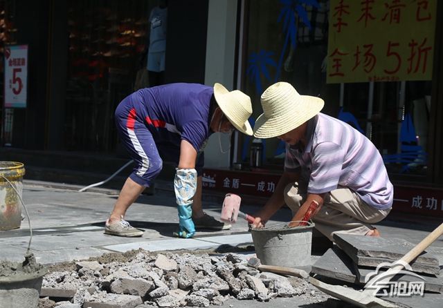 云陽網訊(記者 鄭紅均)8月4日,記者在云江大道發現往日車鬧人雜的人行道上,工人們冒著酷暑正緊張有序地施工,對人行道上破損的路面進行修補。