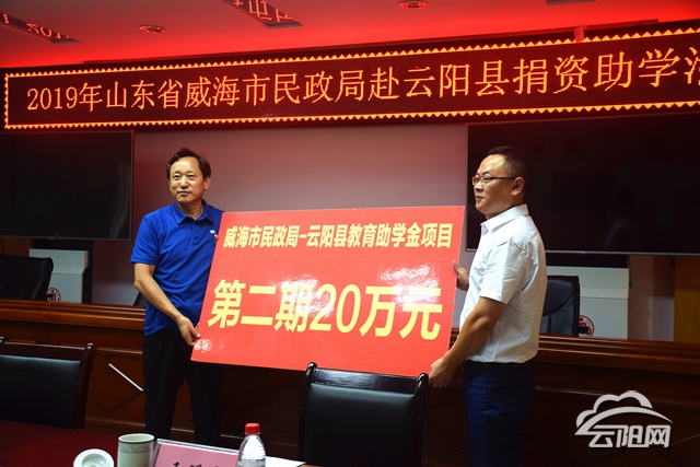 云陽網(wǎng)訊(記者 陳愛玲 實習生 劉超)8月13日,威海市民政局黨委委員、副局長宋寶林一行來云開展捐資助學活動,捐贈20萬元助推教育事業(yè)的發(fā)展。