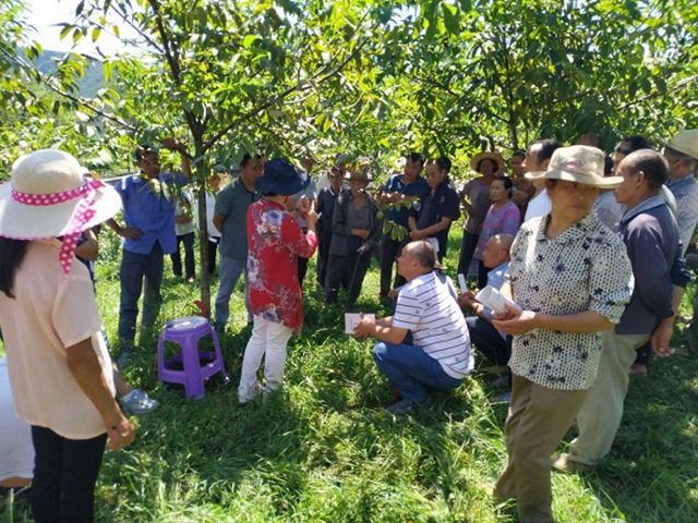 參培村民圍著李教授,對不懂的核桃管護技術進行請教。“原先我只知道除草施肥,通過李教授的講解,我們知道了怎樣對核桃樹修枝整形,怎樣防治病蟲害了。”參加培訓的村民李大哥說。
