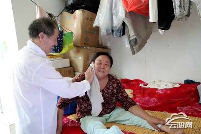 云陽(yáng)網(wǎng)訊(記者 鄧庭庭)每天早上6點(diǎn)鐘,在雙江街道蓮花池社區(qū)一個(gè)出租屋里,61歲的潘友清準(zhǔn)時(shí)起床了,燒好熱水后,便輕聲喚醒還在熟睡的妻子鄧碧英,給鄧碧英洗臉、穿衣、梳頭,然后背起半身不遂的鄧碧英上廁所,待鄧碧英解手完畢,潘友清就把輪椅提到小區(qū)壩子上,然后回家背著鄧碧英,一手扶著樓梯欄桿,一手摟著鄧碧英一步一步向下挪,潘友清把鄧碧英放在輪椅上時(shí),已時(shí)滿頭大汗。