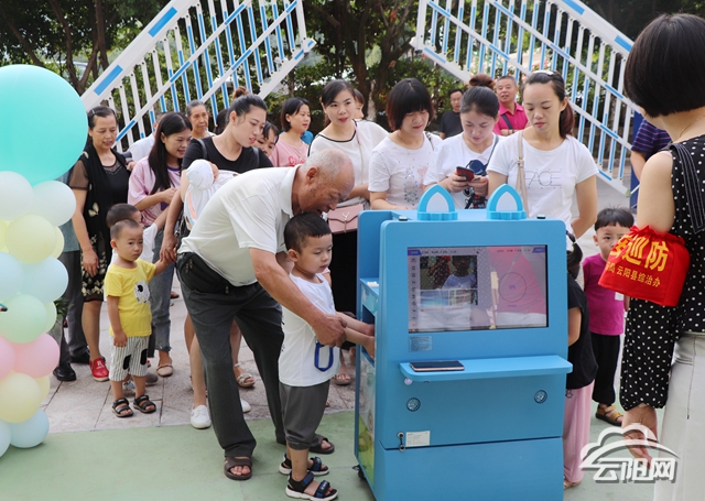 云陽網訊(記者 何競嘉)“小朋友們,把手心朝上放在下面儀器上,再將下巴擱在上面的板上就可以啦!”9月2日,記者在云陽師范學校幼兒園內看到,智能晨檢機器人在教學樓門口等候,對入園的小朋友進行入園前體檢。