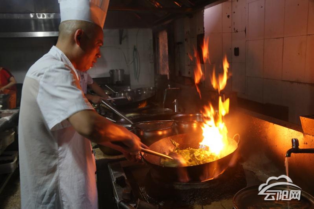 負責炒菜的吳師傅左手握住炒鍋,右手拿著勺子,不斷地翻炒,一道小炒還沒燒好,吳師傅的臉就被熏紅了,廚師帽帽檐邊的發絲也被汗水浸濕,緊貼在額頭上,白色的制服也被汗濕。火吱吱的燃燒,散發出令人難以靠近的溫度。“現在廚房的溫度在60度左右,如果所有的灶在火力全開的情況下,溫度會更高。”吳大廚告訴記者,6月至8月是最難熬的日子,上班期間衣服從沒有干過,汗水進入眼睛是常有的事。當我們走到室外,在40℃的高溫下感覺到的也是涼爽。
