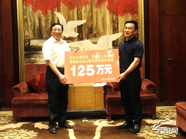 扶貧協作座談會暨捐贈儀式上,縣委副書記丁笙洺向代表團介紹了云陽基本縣情及東西部扶貧協作工作開展情況;王肇剛代表文登區委、區政府向云陽捐贈了價值125萬元物資。