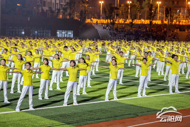 千人廣播體操表演拉開了活動序幕,整齊劃一的動作,昂揚向上的精神面貌,展現了全縣教職工蓬勃向上的時代風采。表演環節中,鳳鳴小學教師身著盛裝,用剛柔并濟的拳法和飄逸靈動的步伐展示了太極拳。實驗小學教師把柔和緩慢、圓活連貫、松緊結合、動靜相兼的武術精髓展現得淋漓盡致。竿動、鈴響、心跳、聲聲入耳,清水九年制學校老師帶來的竹竿舞表演,人、竿、聲、舞四者有機融合,構筑了一幅生動多彩、朝氣蓬勃的畫面。江口小學老師扛著羽毛球拍,踏著整齊有力的步伐,精神抖擻的閃亮登場,靈動的隊形,巧妙的造型,演繹出羽毛球操的技藝與魅力,詮釋“每天鍛煉一小時,健康工作每一天,幸福生活一輩子”的理念。由實驗中學表演的團體操《歌唱祖國》把整場活動推向高潮,伴隨著激昂的鼓點,學生們組成的方陣展開了一幅中華人民共和國地圖,學生們手中的小花逐漸匯聚成大花,場面壯觀,觀眾歡騰,展示出云陽教育繁花似錦、碩果累累。