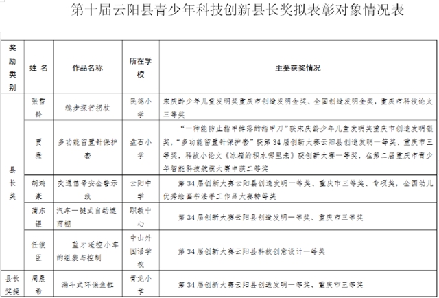 附:第十屆云陽縣青少年科技創新縣長獎擬表彰對象情況表
