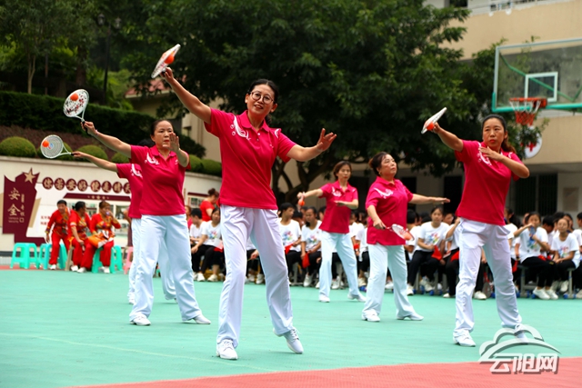 經過一輪熱場展示后,10支參賽代表隊,身著統一服裝,喊著口號、步伐整齊地入場、示意,踩著音樂節拍,身體與球拍融為一體,迎、納、引、拋,擺動、轉體、拋接、繞翻,一套動作行云流水,輕如燕子點水,重如獅子擺頭,展示了大家的精氣神。