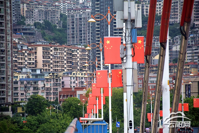 在高速路口、迎賓大道等地,五星紅旗工整地排列在公路兩旁,構成一道道紅旗長廊,盡顯神圣與莊嚴;在長江大橋,一面面紅旗串連成線,在江風的吹拂下盡情飄揚,橫跨長江的氣勢顯露無遺;在望江大道和濱江大道等城區中心區域,五星紅旗在綠蔭下若隱若現,與周圍的車流、高樓交相呼應,為街頭增添了節日的喜慶。