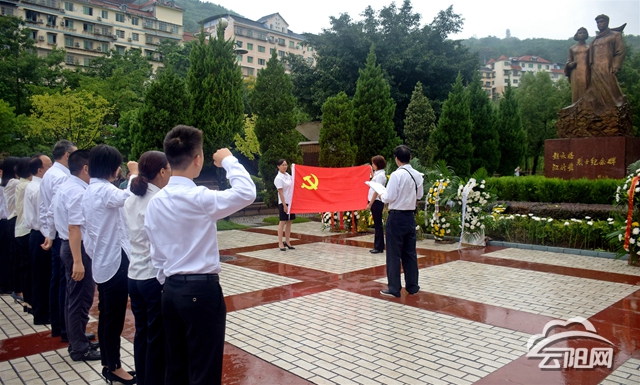 在彭詠梧、江竹筠烈士雕像前,黨員們敬獻花籃,深深鞠躬,懷著崇敬的心情緬懷革命先烈。“我志愿加入中國共產黨……”在場機關黨員面對鮮紅的黨旗莊嚴肅穆地重溫入黨誓詞。
