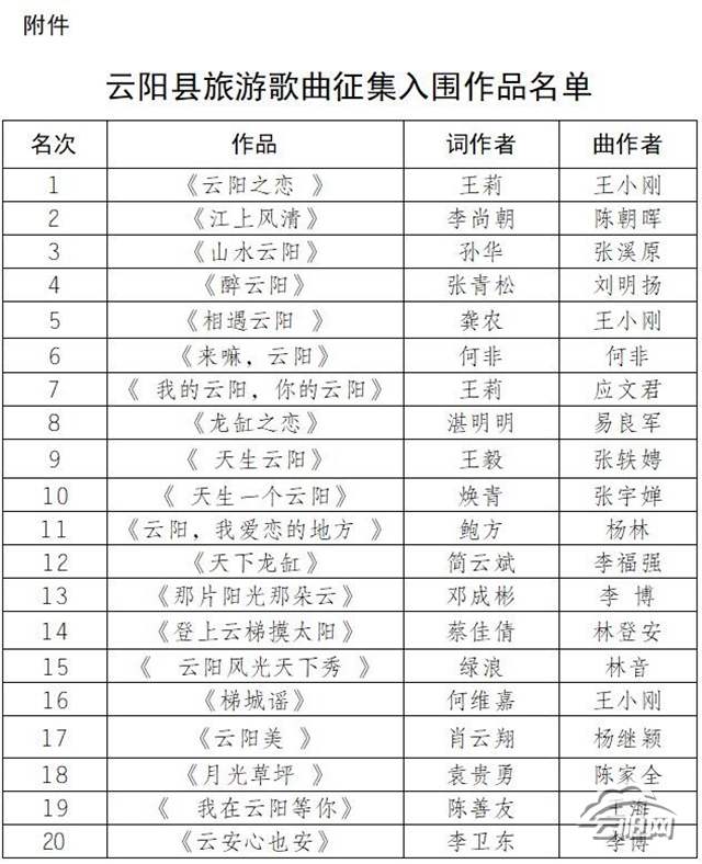 此次活動共征集了來自全國23個省市自治區(qū)413首歌曲,經(jīng)過初審、專家初評和專家復(fù)評層層篩選,評選出了優(yōu)秀歌曲20首,再由市民投票,根據(jù)得票數(shù)進(jìn)行量化計(jì)分得出排名。其中,王莉作詞、王小剛作曲的《云陽之戀》榮獲金獎;李尚朝作詞、陳朝暉作曲的《江上風(fēng)清》,孫華作詞、張溪原作曲的《山水云陽》,張青松作詞、劉明揚(yáng)作曲的《醉云陽》,龔農(nóng)作詞、王小剛作曲的《相遇云陽》榮獲銀獎;何非作詞作曲的《來嘛,云陽》,王莉作詞、應(yīng)文君作曲的《我的云陽,你的云陽》,湛明明作詞、易良軍作曲的《龍缸之戀》,王毅作詞、張軼娉作曲的《天生云陽》,煥青作詞、張宇嬋作曲的《天生一個云陽》榮獲銅獎;其他10個作品榮獲優(yōu)秀獎。