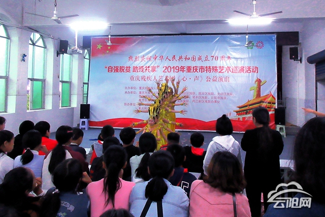 云陽網訊(記者 李充 通訊員 鄭章彥)“自強脫貧,助殘共享。”10月21日,重慶殘疾藝術團《心·聲》公益演出在人和初級中學大禮堂舉行,該校師生共同觀看了這場精彩而感人的表演。