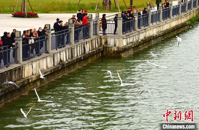 圖為紅嘴海鷗遷徙至合川三江引市民游客駐足。 羅永皓 攝