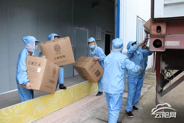 當(dāng)天下午,在云陽(yáng)縣蕓山農(nóng)業(yè)紅獅加工廠,一片繁忙,工人們正忙著將加工之后的菊花裝箱,利用集裝箱車運(yùn)往新加坡。